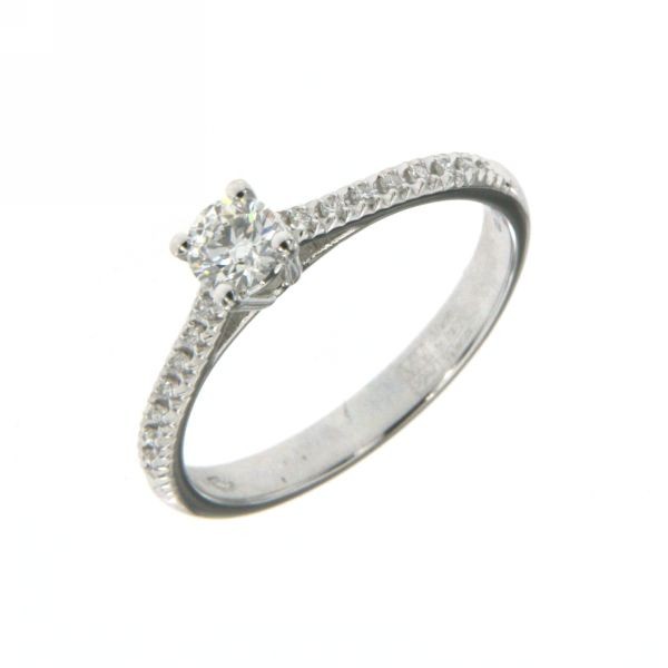 Scopri i dettagli di Anello donna oro bianco Solitario Contorno con diamanti ct. 0,18 F VS Misura 14 - Mirco Visconti Gioielli