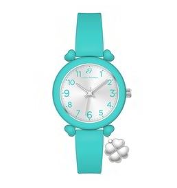 Orologio acquamarina con charm quadrifoglio. Diametro cassa: 31,5 mm Movimento Miyota, 5 ATM Solo Tempo