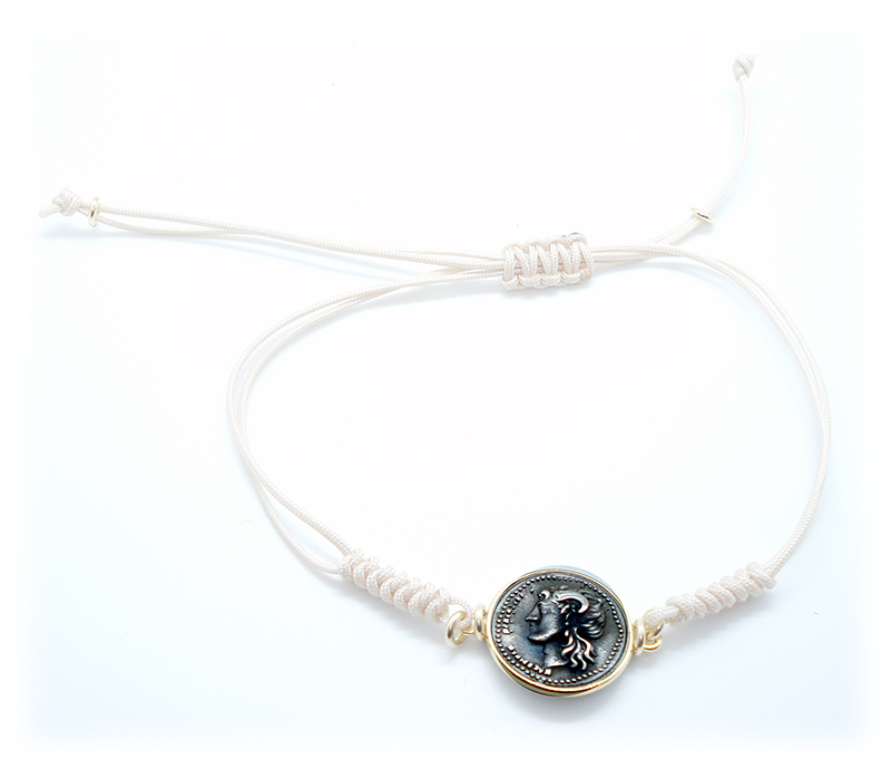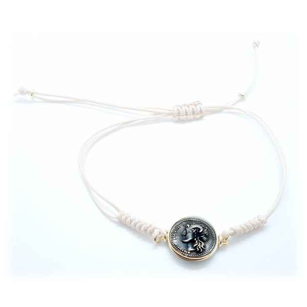 Scopri i dettagli di Bracciale unisex Made in Nuceria - Moneta Didramma in argento - cordino beige - Gioiello Artigianale - Marte