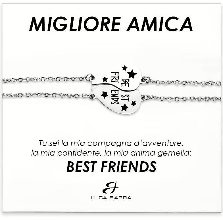 Questi braccialetti sono un simbolo di legame indissolubile, con ciascun braccialetto che porta un mezzo cuore che si completa solo quando siete insieme, proprio come voi e la vostra amicizia. Il mezzo cuore è finemente lavorato e presenta la scritta ""Best Friends"", rendendo questi braccialetti un omaggio alla vostra amicizia speciale.