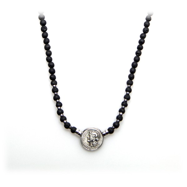 Scopri i dettagli di Collana donna Made in Nuceria - Moneta Didramma in argento e pietra lavica - Gioiello Artigianale - Vulcano