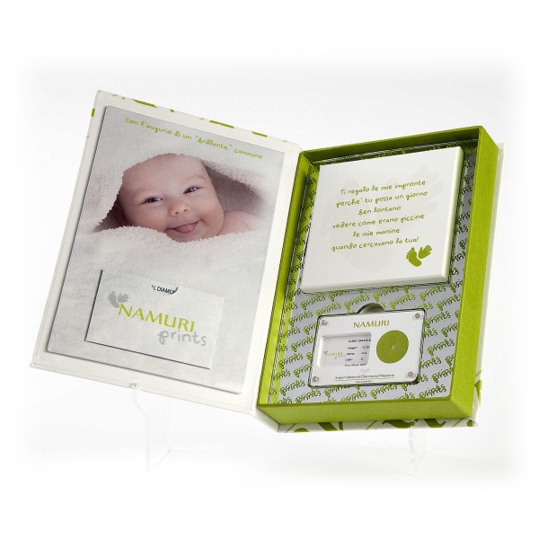 Nella confezione regalo è inclusa una tavoletta modellabile per rilevare l'impronta del piedino o della manina.