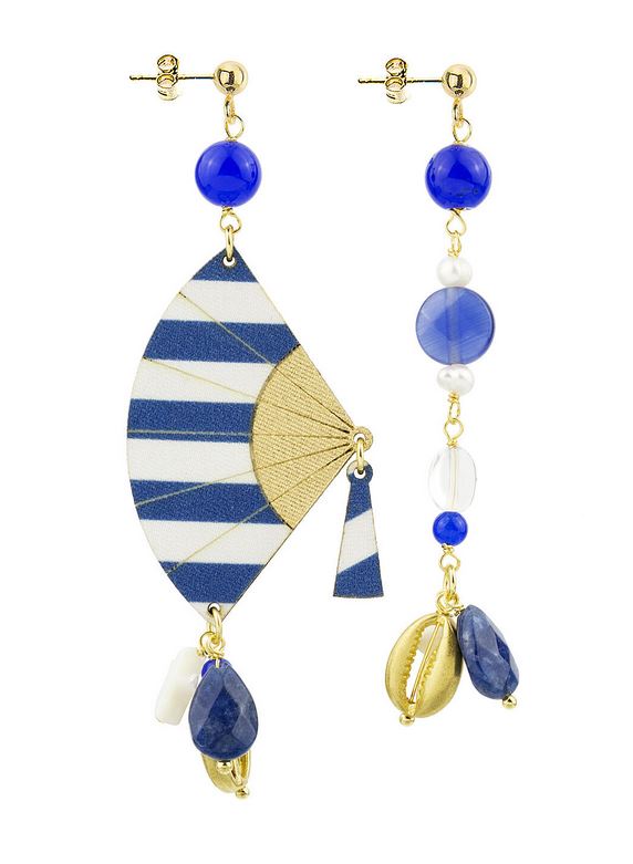 Orecchini in tessuto a righe, ottone galvanizzato oro e pietre naturali. Lunghezza 7.5 cm. Chiusura perno e farfalla. Made in Italy